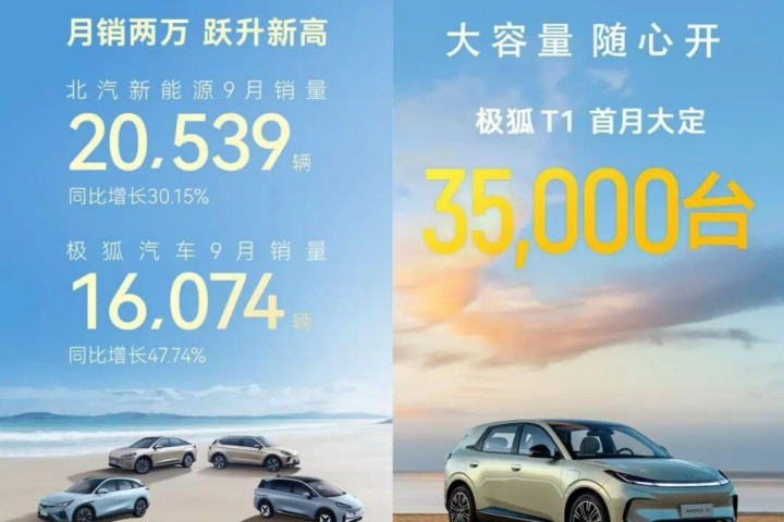 北汽新能源9月销量20539辆,同比增长30.15%;极狐9月销量16074辆,同比增长47.74%。其中,极狐T1大定35000辆,“极狐炸哥”张国富抛出的终极王炸受到了市场的积极反馈。